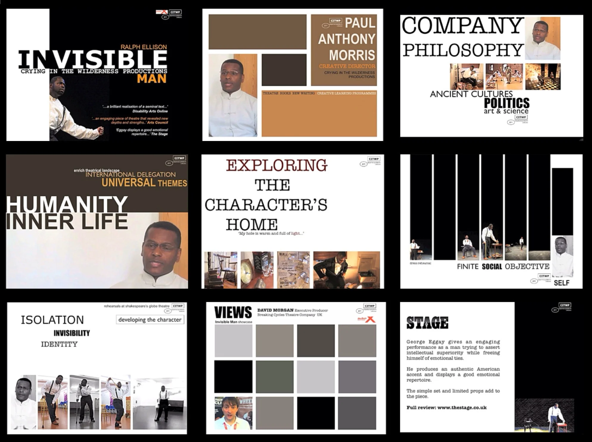 This documentary film records the creative process undertaken by Paul Anthony Morris and his company Crying In The Wilderness Productions as they prepared the Invisible Man showcase for the International Decibel Performing Arts Festival in Manchester.